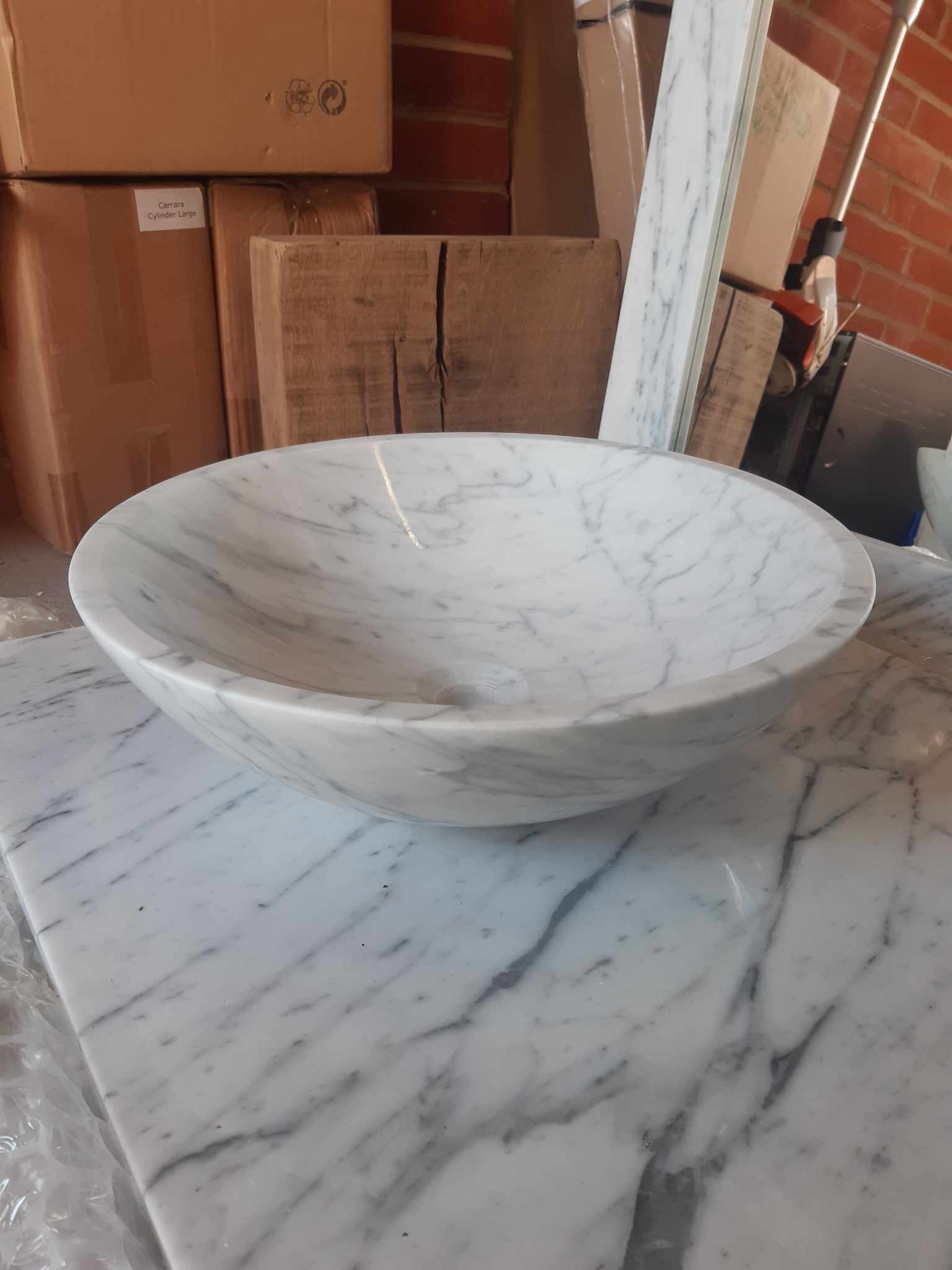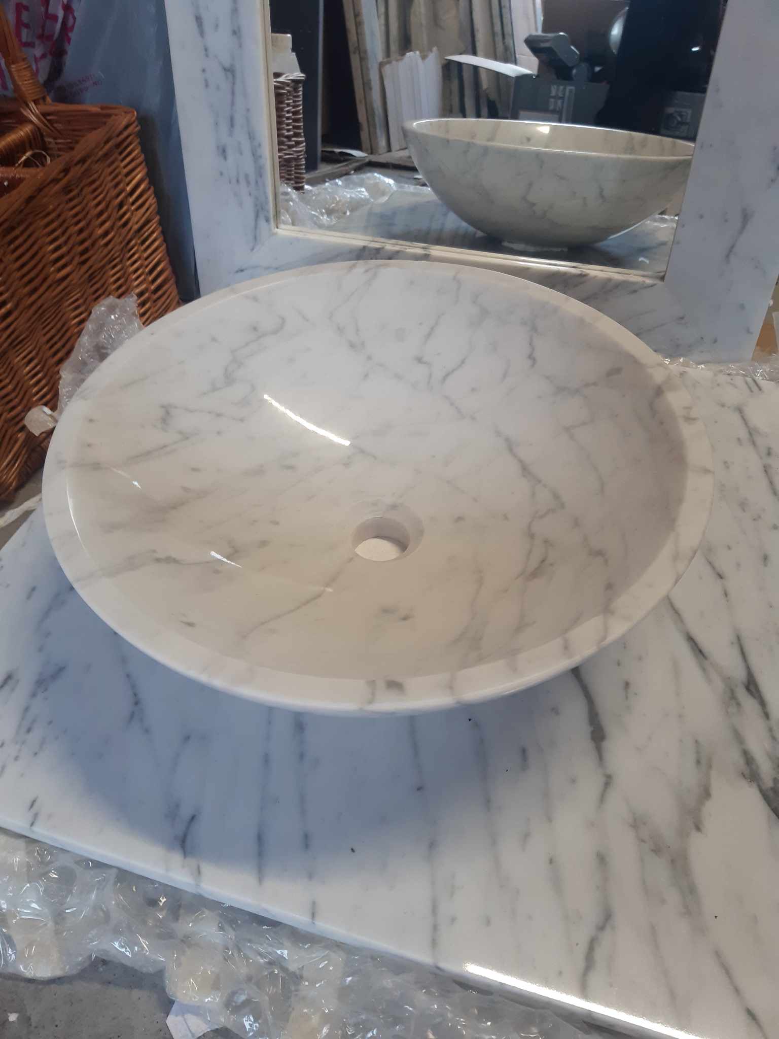 Large marble mirror frames are quite rare and it would cost a small fortune to have one commissioned by a marble fabricator here in the UK. That is why I decided to address this by importing a number of these frames along with the matching polished carrara marble basins. These pieces produce a wonderfully luxurious look when used in combination. The marble basin measures 43cm diameter by 13cm high and the marble mirror frame 61cm by 91cm. The mirror frame can be hung landscape as well as portrait. £380 for the set or £160 for the basin on its own and £220 for the mirror (which includes the fitted mirror in the frame).